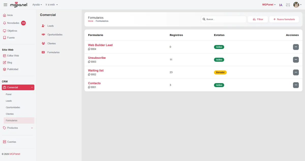 Lo primero es entrar en el corazón de la captación. Ingresa en tu MGPanel, dirígete al menú lateral y selecciona Comercial > Formularios. Aquí es donde sucede la magia.